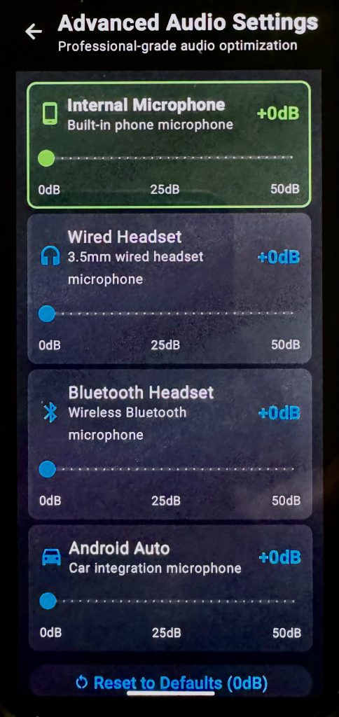 - Diverse Audio Einstellungen zum Anpassen der Mic-Gain (internes Mikrofon, Headset, Bluetooth, Android Car)