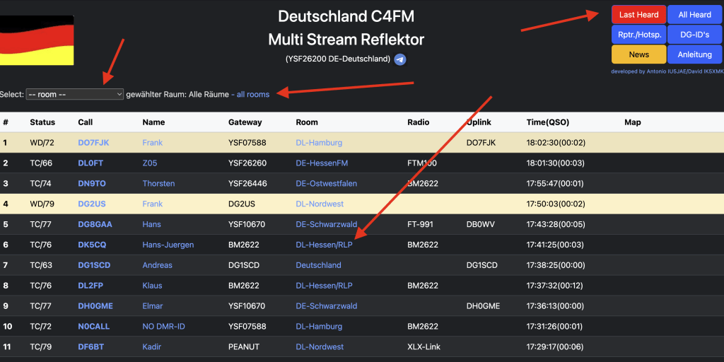 Im Bereich „Last Heard“ wurde eine Dropdownliste zur Filterung der Räume eingeführt. Diese Filterung ist auch möglich wenn man auf den Raumnamen in der Liste klickt. Mit Aktivierung des Link „Alle Räume“ werden wieder alle DG-ID’s angezeigt. Um einen Direkt-Link in einen Raum zu realisieren kann die URL folgendermaßen „zusammengebaut“ werden. https://ysf-deutschland.de/main2.php?room=<DG-ID> z.B. https://ysf-deutschland.de/main2.php?room=76