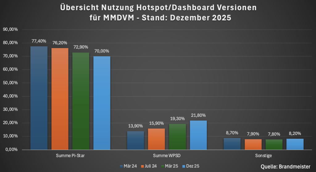 Bei der Hotspot Software bzw. Dashboards dominiert weiterhin mit großem Abstand Pi-Star mit 70,0 % bei allerdings weiterhin sinkender Tendenz. Das WPSD Dashboard gewinnt weiter Marktanteile und liegt im Dezember 25 bei 21,80 %. Auffällig ist, daß beim WPSD kaum alte Versionen im Einsatz sind und hier regelmäßig durch die User Updates gemacht werden. Dies ist weiterhin ein großer Unterschied zu Pi-Star.