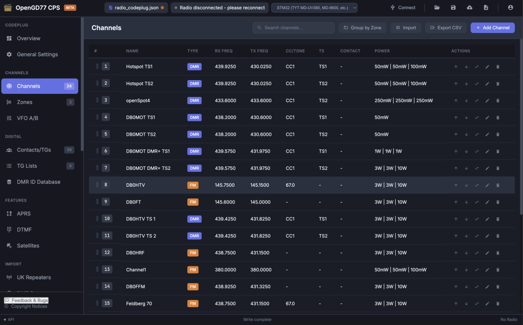Ich habe unter MacOS mit dem Vivaldi Browser un meinem Retevis RT3S ausprobiert und es scheint ganz gut zu funktionieren. Ich habe bei den Einstellungen für die Sendeleistung noch einen Bug finden können. Es ist allerdings noch eine Beta und Ihr solltet Euren Codeplug vorher sichern, um bei Problemen wieder den alten Stand herstellen zu können. Verwendung auf eigenes Risiko.